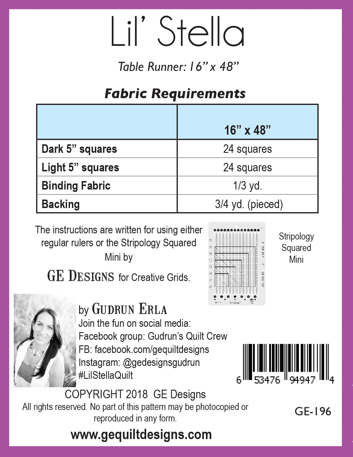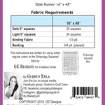Use light and dark charm squares to make this cute and quick runner with the Stripology Squared Mini Ruler. Make it for the holidays or a red white and blue theme. Full color instructions include how to use regular rulers as well. Size 16" x 48".