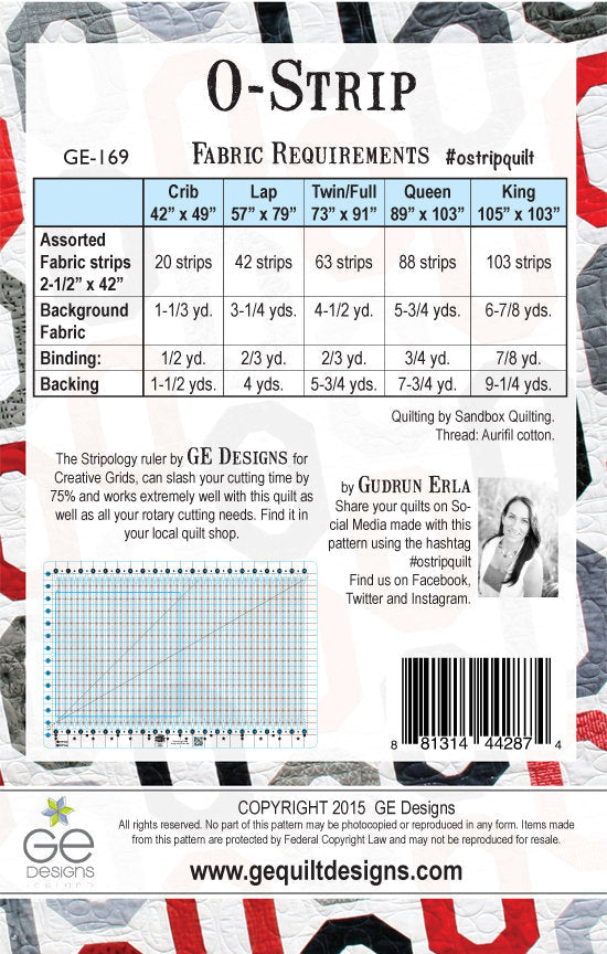 Perfect for a graduate from a school that starts with the letter O. Fun and fast quilt to make with a Jelly roll or 2-1/2" strips. It features the Stripology ruler by GE Designs that can reduce your cutting time by 75%. The pattern comes with 5 different size options: crib, lap, twin/full, queen and king.