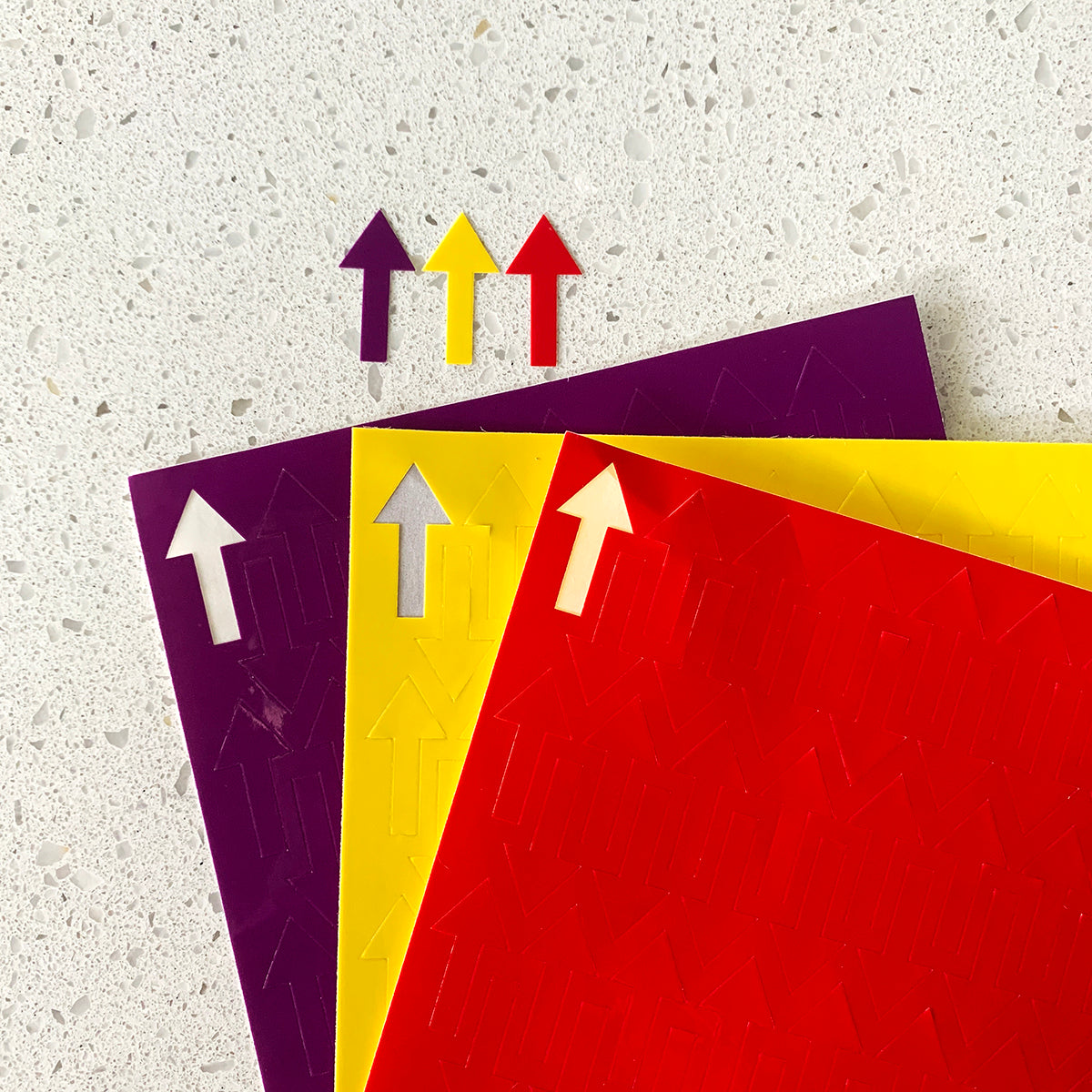 Easily mark your rulers, templates, cutting mats and more! Make your cutting more accurate, consistent and faster. Easily removable without any residue. You can reuse and reposition the stickers a few times. Sticker arrows in 3 bright colors, total of 192 stickers. 1 sheet each of 3 purple, yellow and red or for more fun: Grape Ape, Lemon Drop and Strawberry Daiquiri. Write on the stickers with permanent marker pens or wet erase pens. Works extremely well with the Stripology rulers.